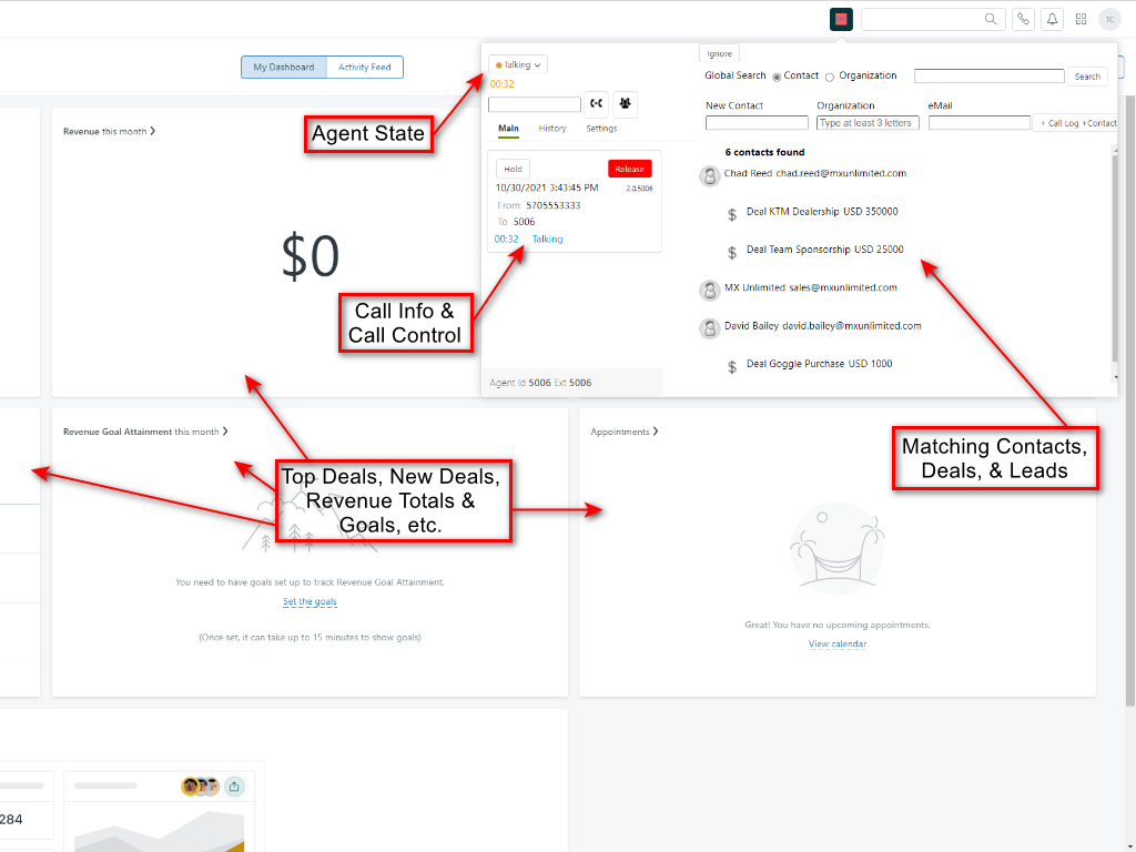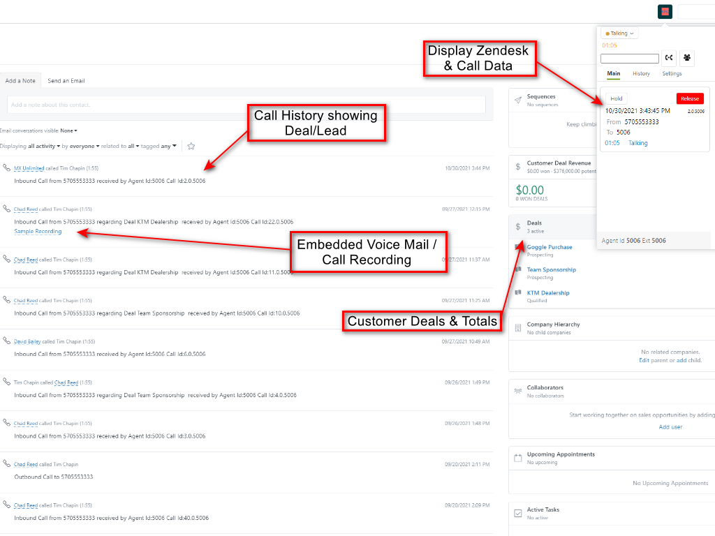 The CDC Platform with Zendesk and Asterisk telephony connectors provides integration between your Asterisk telephony system and your Zendesk environment. The platform supports searching, displaying, and creating Zendesk items based on the call data associated with a voice call. Leverage the information collected within your IVR, Voice Portal, ACD, databases, and web services to 'Screen Pop' the agent's Zendesk session with new or existing Zendesk users, tickets, and more.