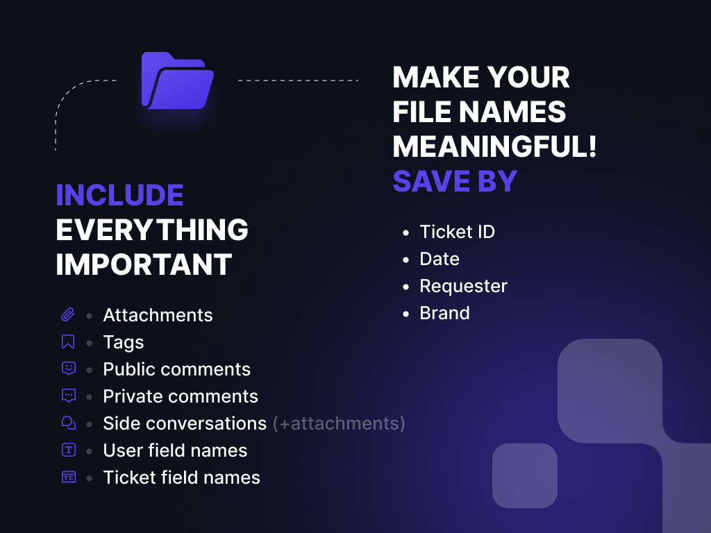 Name the exports flexibly, based on ticket ID, requester, or brand.