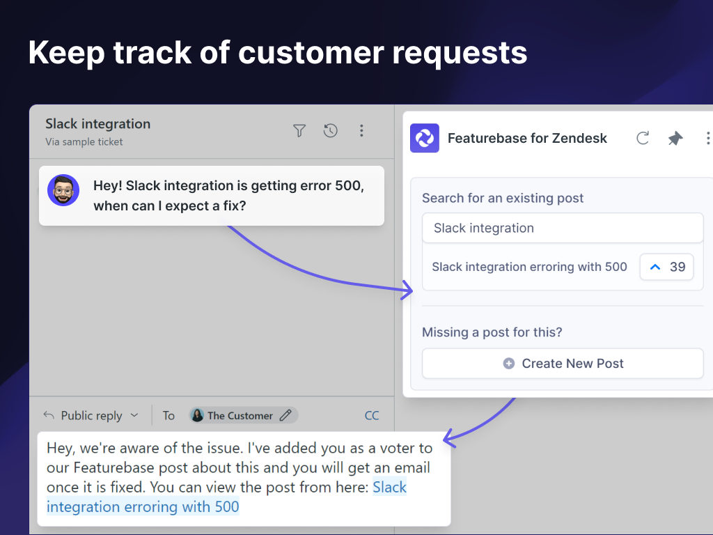 Every time someone mentions a certain topic (e.g. a feature request or a reports a bug), you can open up the Featurebase tab in Zendesk to search for an existing post about the topic or create a brand new one. You can then subscribe the user to email updates about that specific issue along with other similar users.