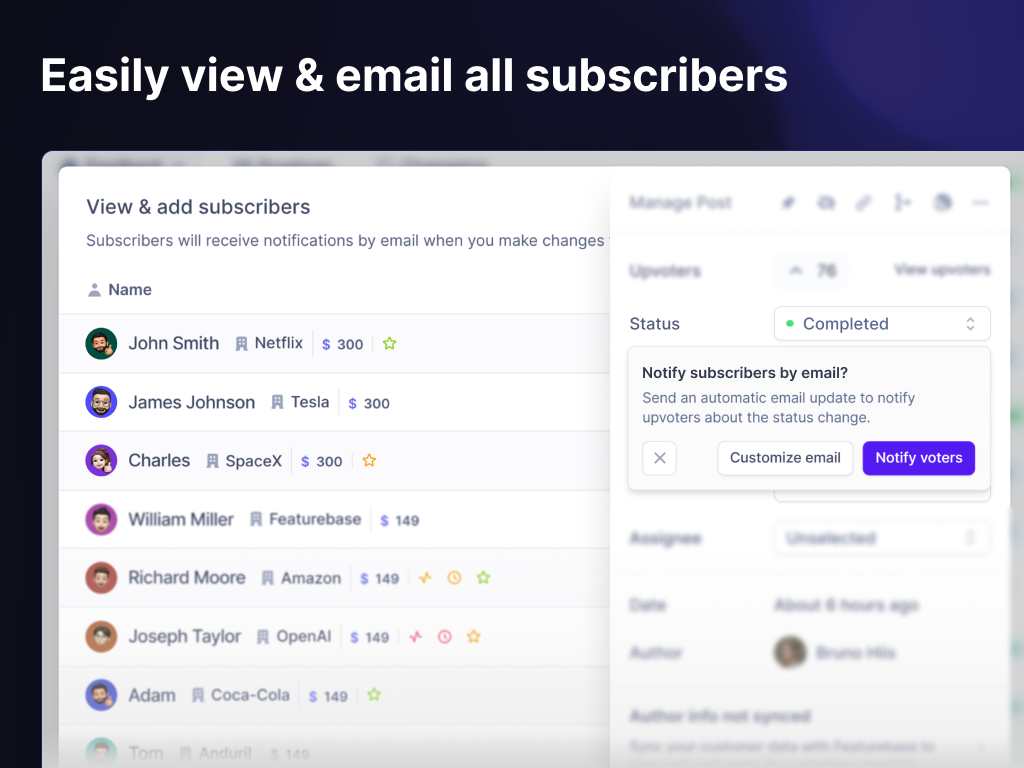 Once an issue has gathered enough interest in Featurebase, you can choose to implement that into your product. When released, just change the issue status from In Progress to Completed and an email will be automagically sent to all the subscribers at once. No need to update hundreds of users individually.