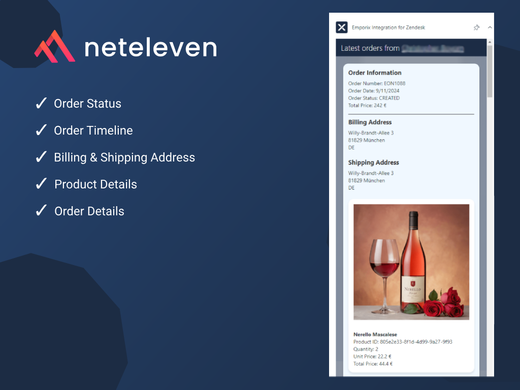 Emporix Connect for Zendesk Support integrates order information directly into the ticket view. Support agents can quickly access key order details such as: