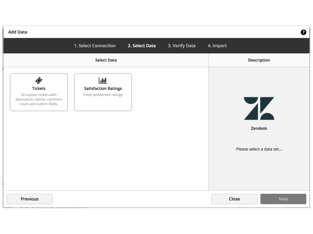8. Select "Tickets" or "Satisfaction Ratings" from the list of data sets available.