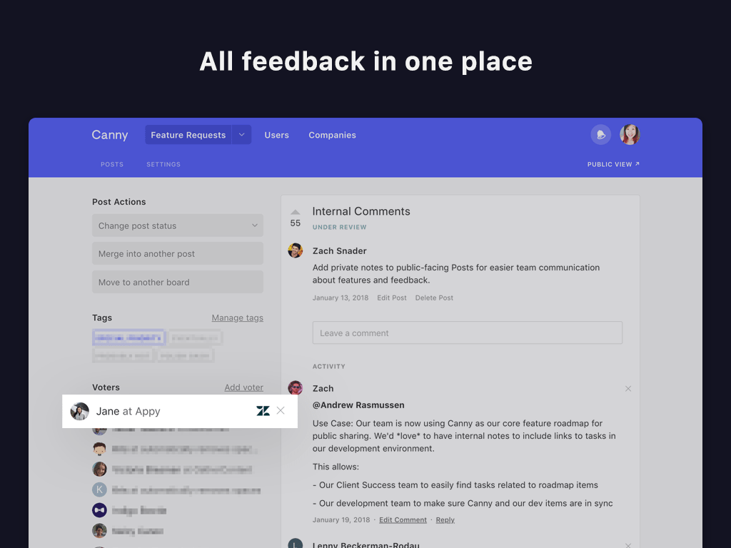 Canny for Zendesk is a two-way integration that lets you link Zendesk tickets with Canny posts. This helps your customer-facing teams relay feature requests to your product team in an organized way.