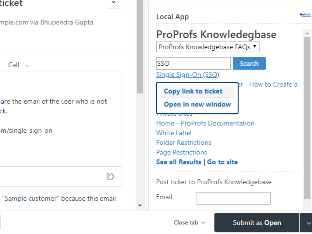 Zendesk and ProProfs is a powerful combination that can help you deliver delightful experiences to your customers. Your agents can use the ProProfs Knowledge Base app to resolve tickets on Zendesk. The app eliminates the need to open various articles for ticket resolution. It saves time by helping your agents find the right knowledge Base article link, and paste it in the ticket. Accessing knowledge is a breeze with the ProProfs Knowledge Base app.