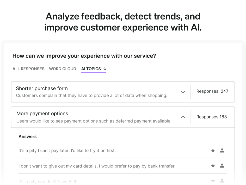 Analyze your results. View overall trends or drill down into individual responses in the Survicate analysis dashboard. Use AI-powered insights to detect patterns and improve customer experience.