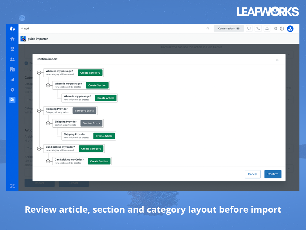 With Zendesk Guide you can create a help center with a knowledge base for publishing self-service content. By doing so, you enable customers to solve their problems by themselves without contacting you customer service agents. This works well, if your help center is up to date and complete. The Leafworks Guide Importer app helps you to organize your help center and lets you change and update articles in no time.