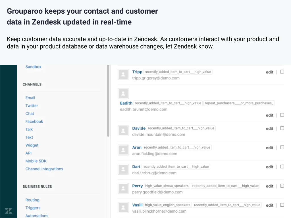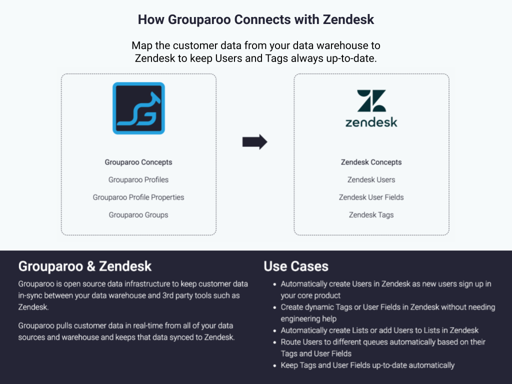 Grouparoo syncs your customer data from your data warehouse to Zendesk.