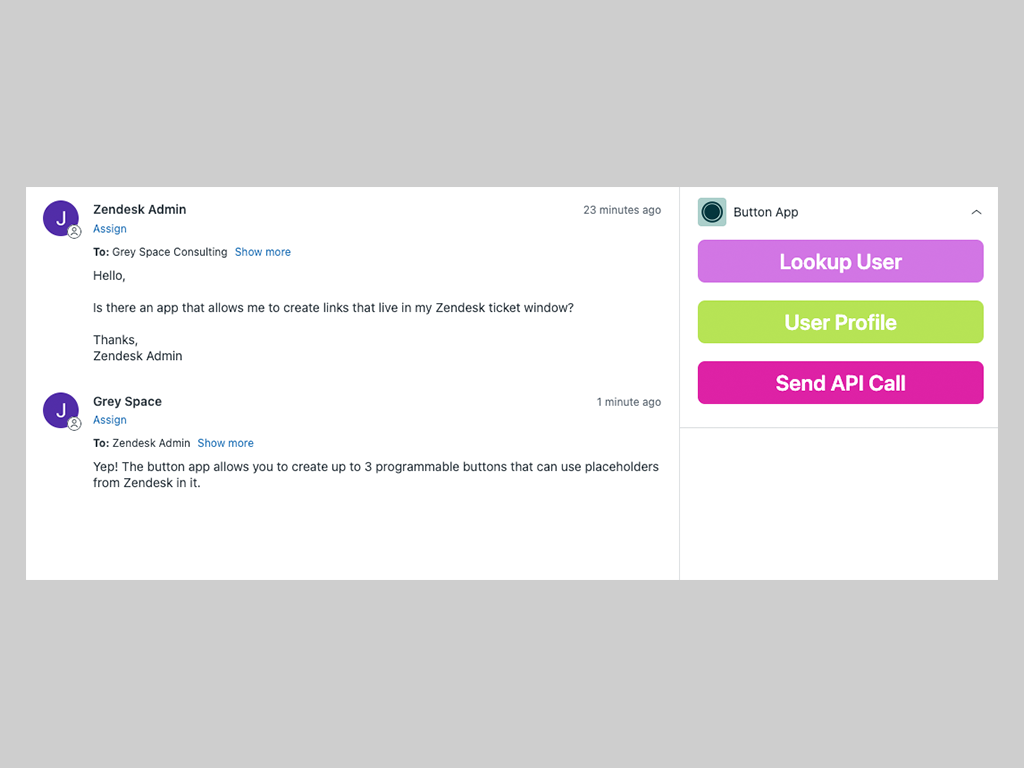 Grey Space releases apps that help fill in the gaps left by existing platforms. We manage these platforms all day, every day and through that experience we see where there is room for growth. The Button App helps fill in the gap of utilizing Zendesk data in your other platforms.