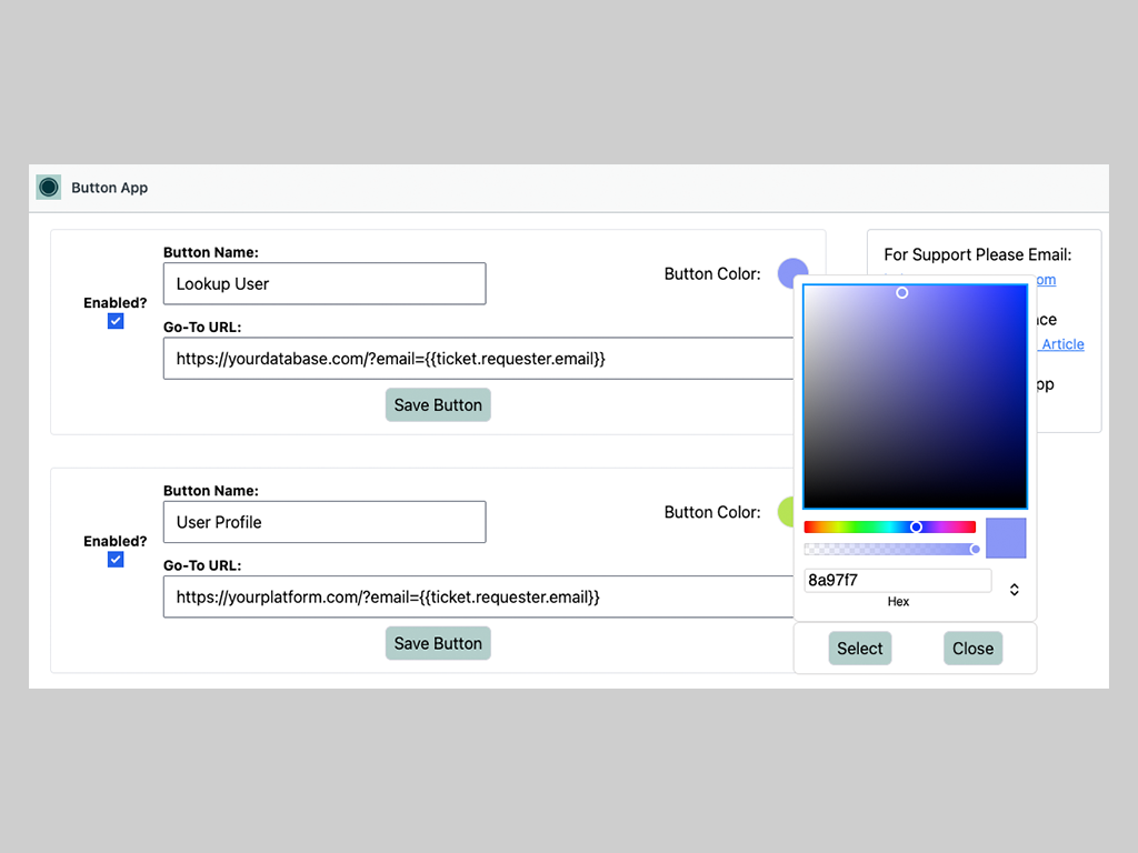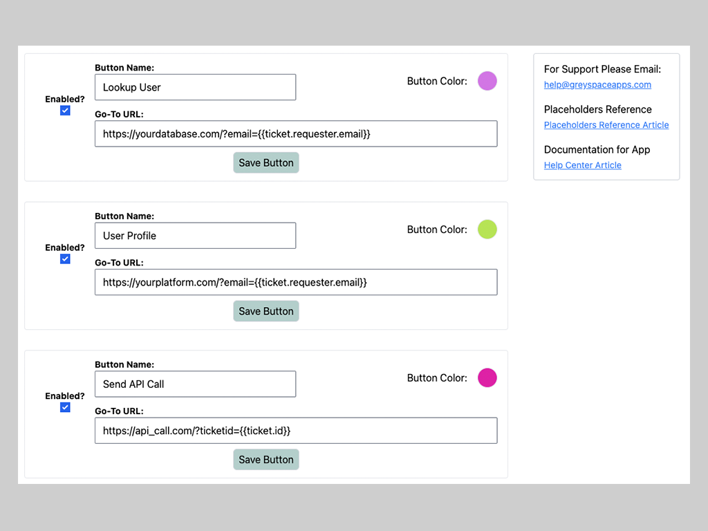 Let’s say you have your internal tool and the url is internaltool.com, and you are on a ticket where the requester is buttonapp@greyspaceapps.com. If you have query parameters created that allow you to search a user by their email the Button App will allow you to link directly to that profile. Create a button that links to internaltool.com/?email={{ticket.requestor.email}}. This will pull the email from the ticket, and direct you to internaltool.com/?email=buttonapp@greyspaceapps.com.