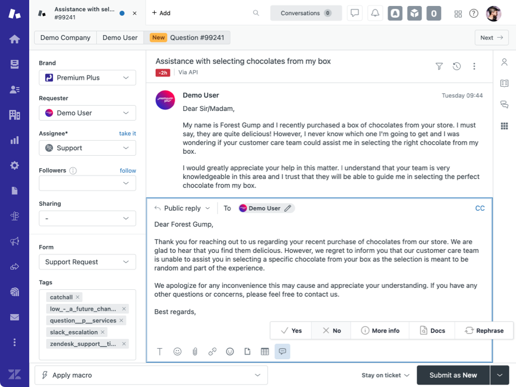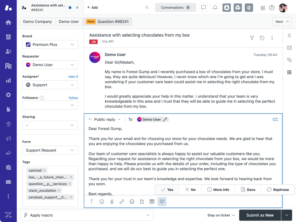 The ChatGPT Suggested Reply App generates meaningful replies for agents to send to your customers.The App uses ChatGPT to generate a comprehensive answer based on the context of the ticket, or on your Help Center articles.