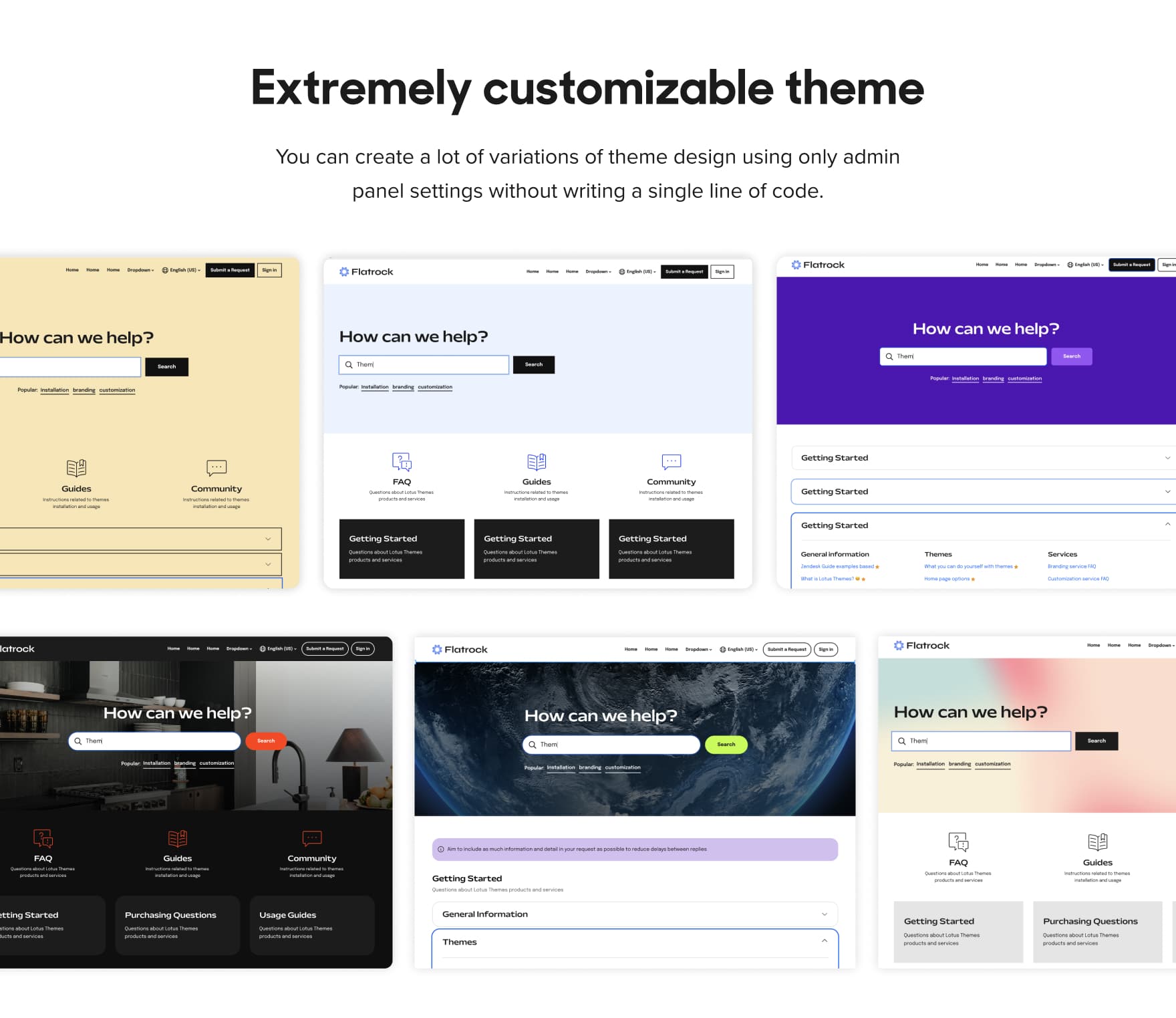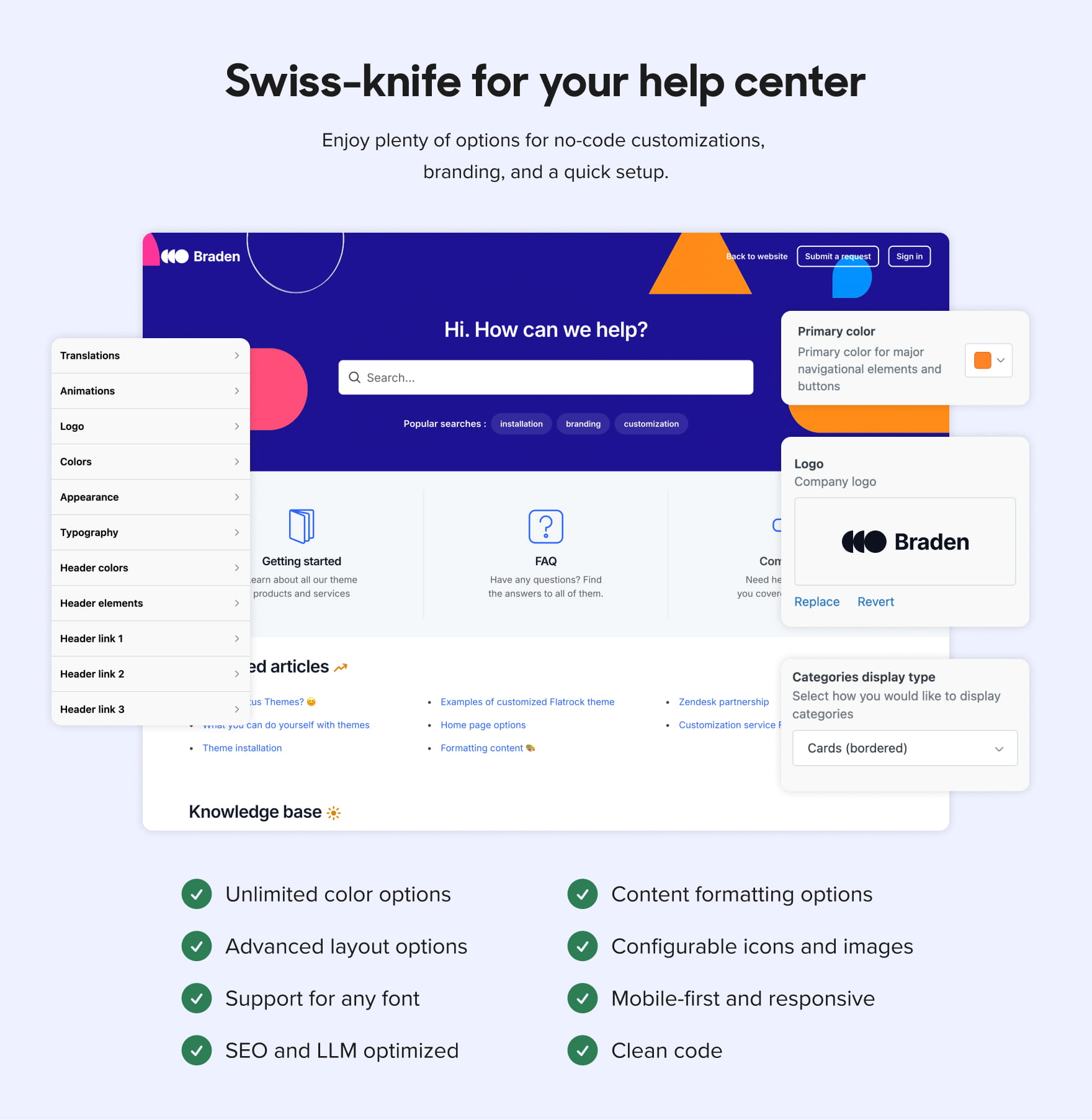 Braden is a Zendesk theme with a large hero unit on all pages and a sticky header with a search bar that is visible at all times. It has a playful and bright design. The theme includes the Table of contents extension.