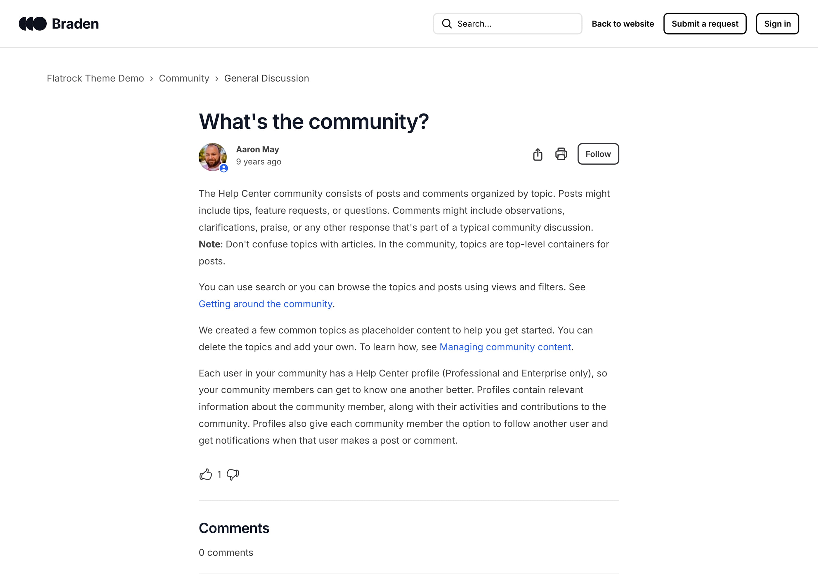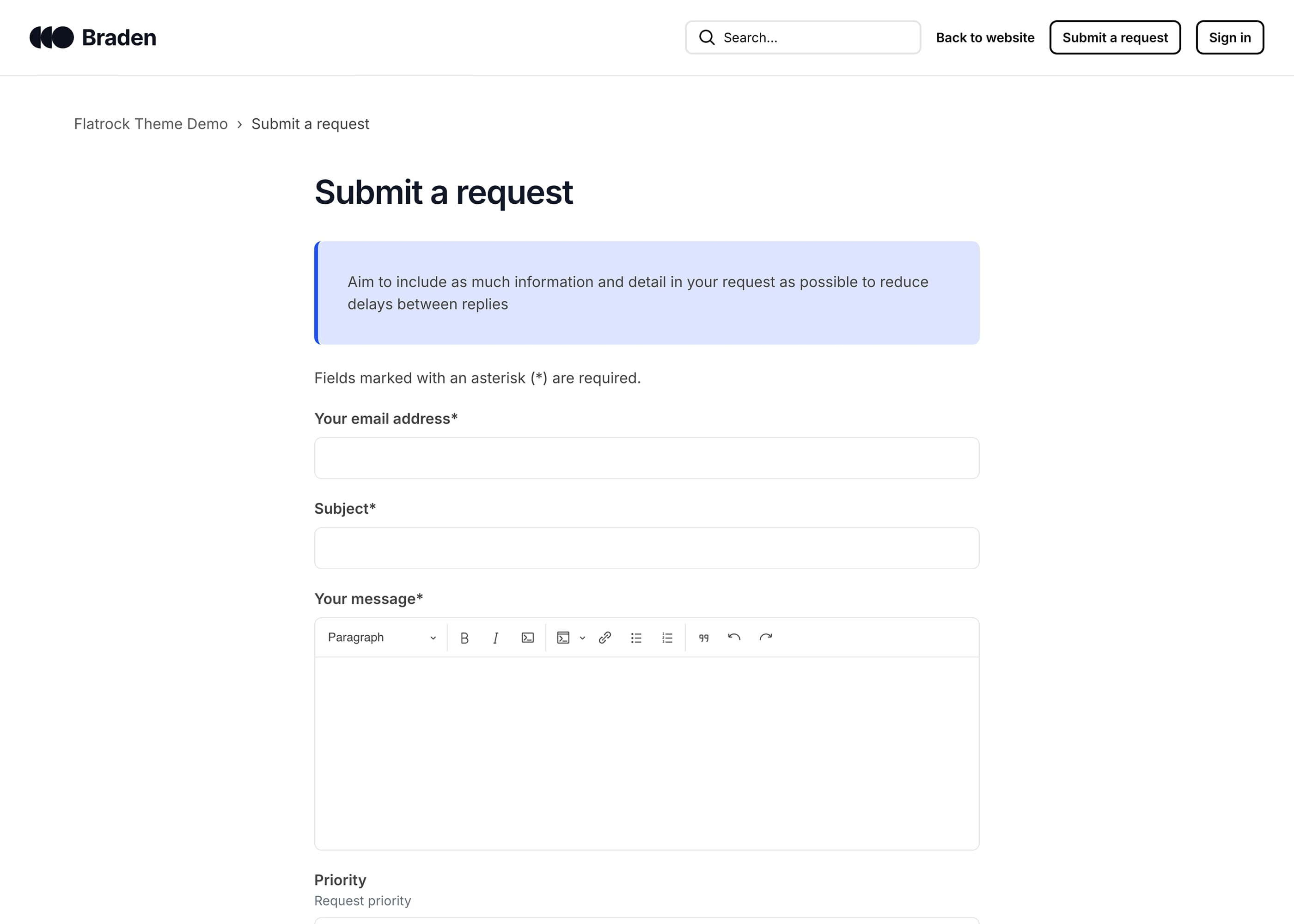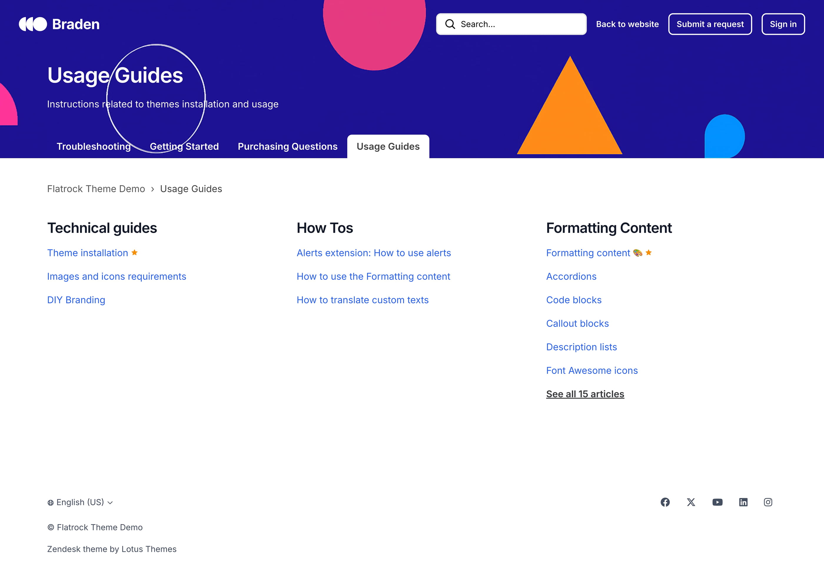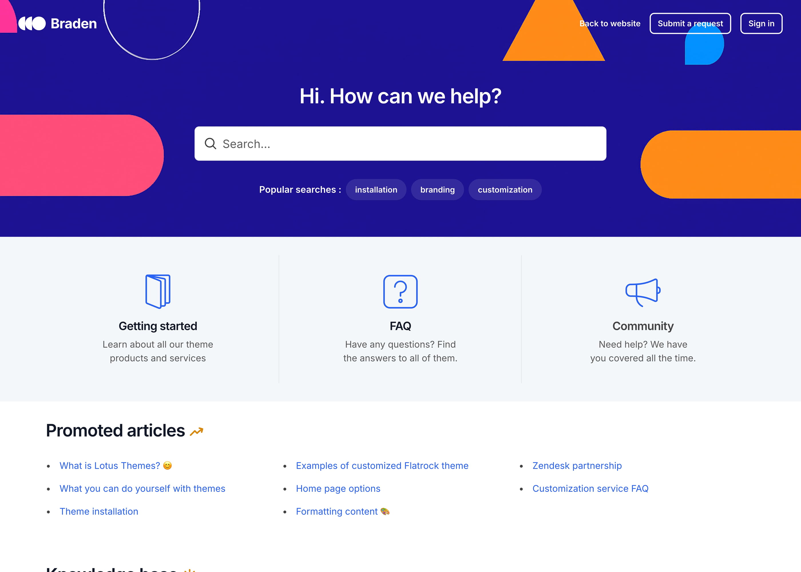 Braden is a Zendesk theme with a large hero unit on all pages and a sticky header with a search bar that is visible at all times. It has a playful and bright design. The theme includes the Table of contents extension.