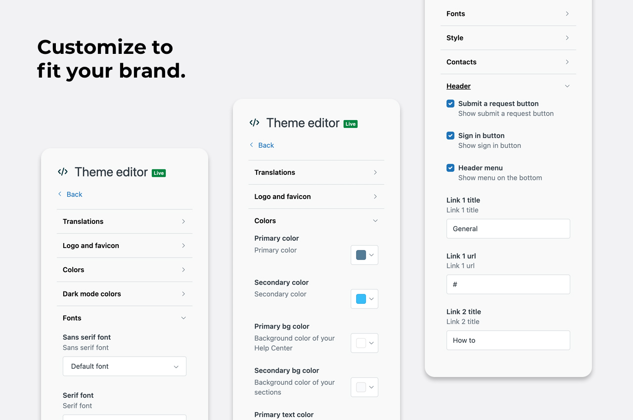 Play around with different styles and designs to reflect your unique identity. Adapt colors, images, icons, fonts, and logos: our Zendesk theme offers easy help center customization without coding.
