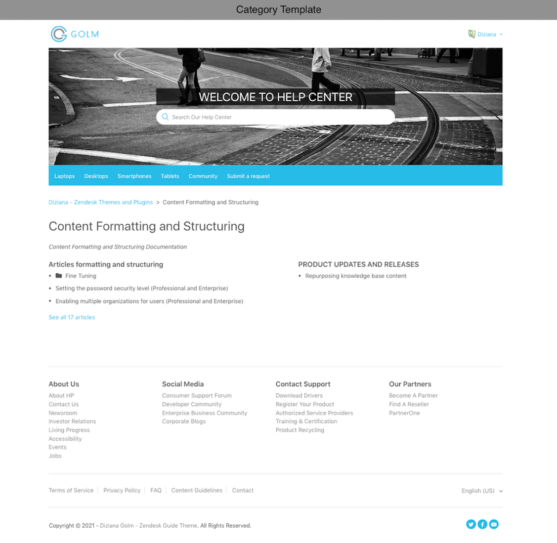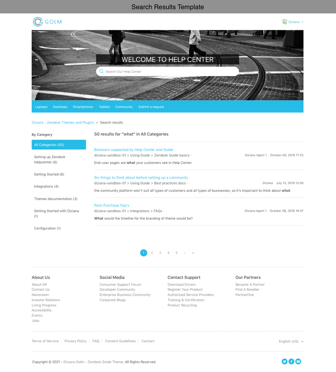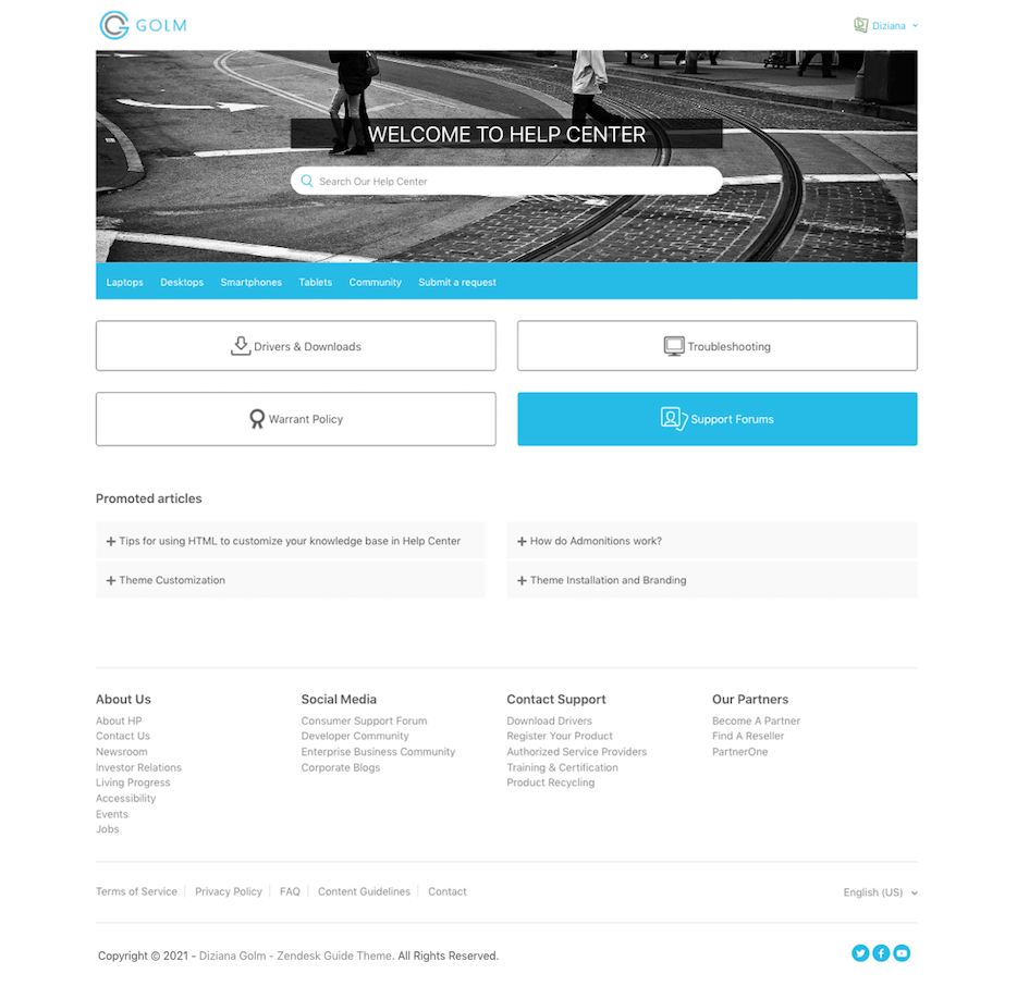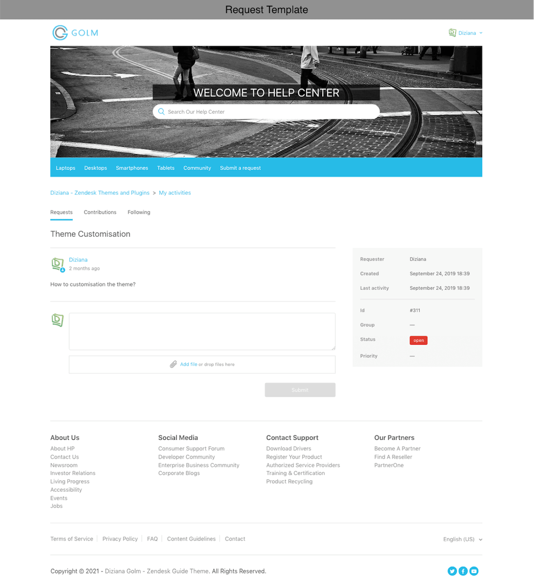 Diziana Golm is a fully responsive Zendesk® Guide Help Center Theme (templates); an elegant one.