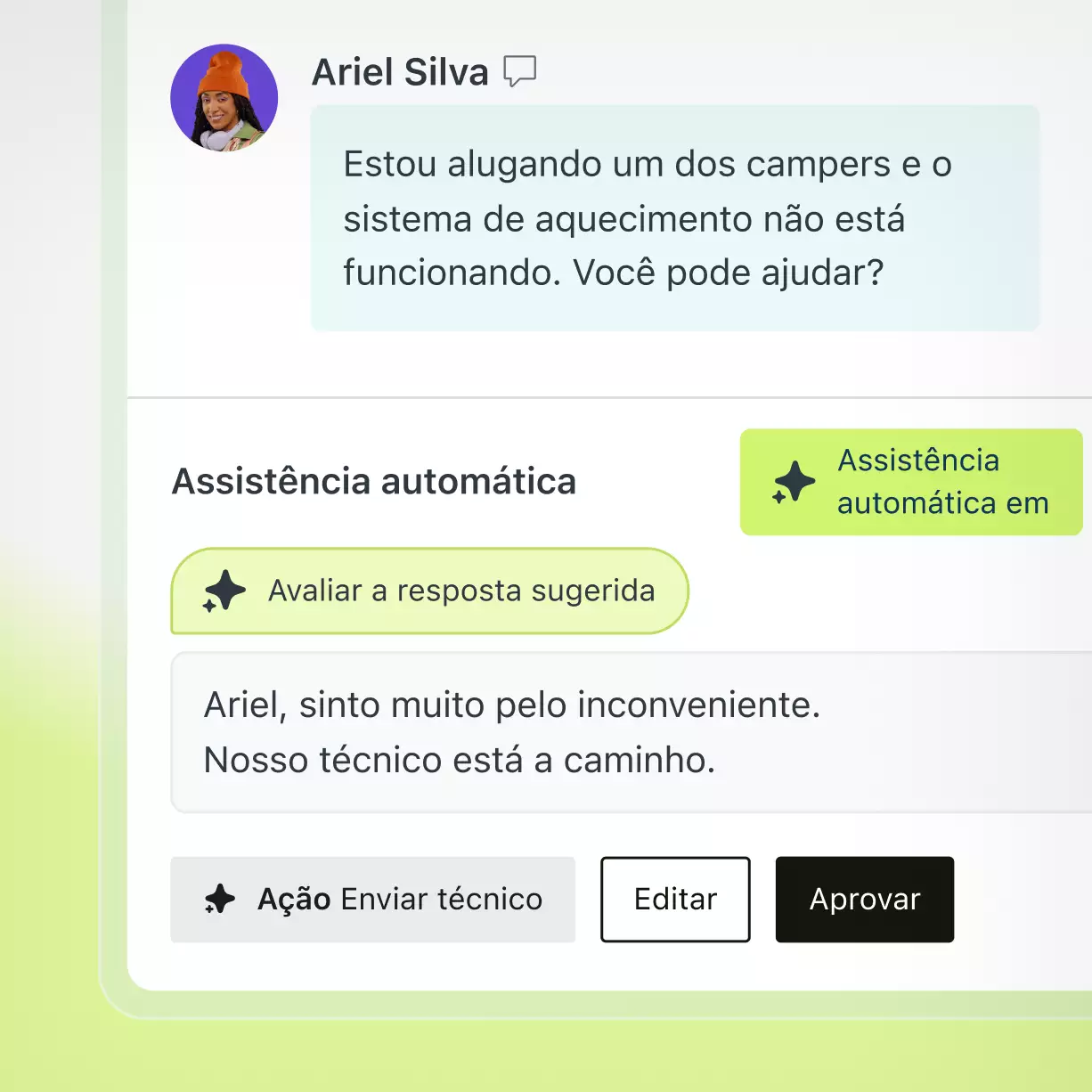 Os agentes de IA são criados para funcionar como o primeiro ponto de contato, administrando as conversas com o cliente de ponta a ponta. Quando um ticket precisa de toque humano, o copiloto IA auxilia o agente fornecendo contexto, sugerindo os próximos passos e até mesmo tomando medidas.