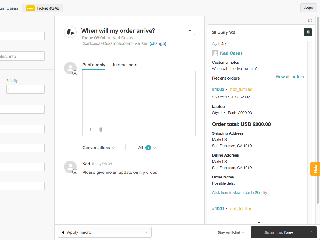 - Solve chats and tickets faster by having access to relevant customer data from Shopify, such as billing, shipping, and order information, from within Zendesk.